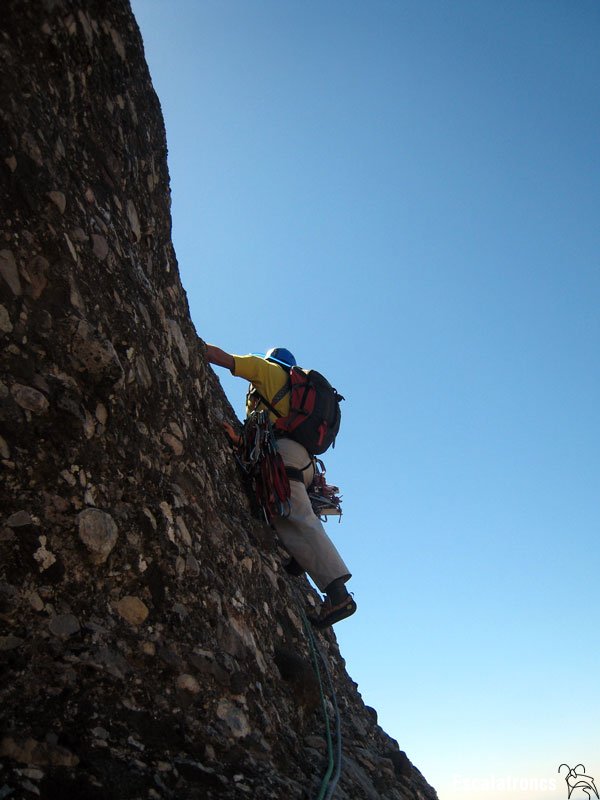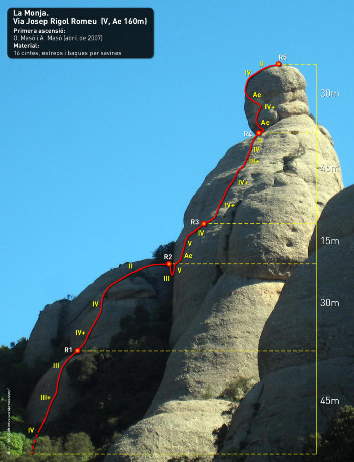 Sortim de la reunió anant a cercar una fissura evident. Escalem en artificial fins que sortim en lliure a una petita lleixa. D’aquí anem en tendència a l’esquerra per tornar a escalar en artificial. Superem la part més vertical i desplomada del cap de La Monja i quan va perdent verticalitat sortim en lliure fins al cim. 30 metres, 13 espits, 2 claus i un pont de roca.