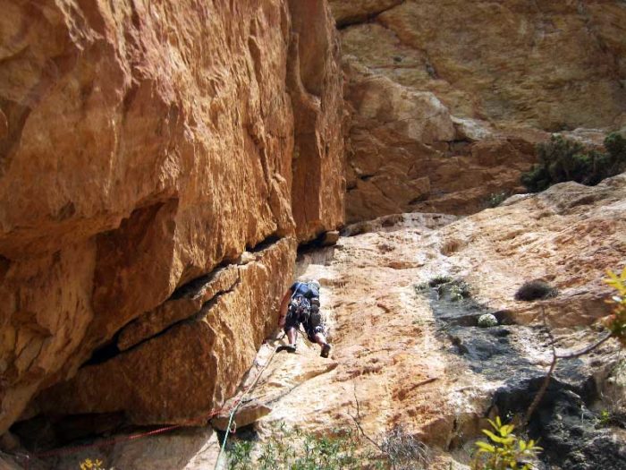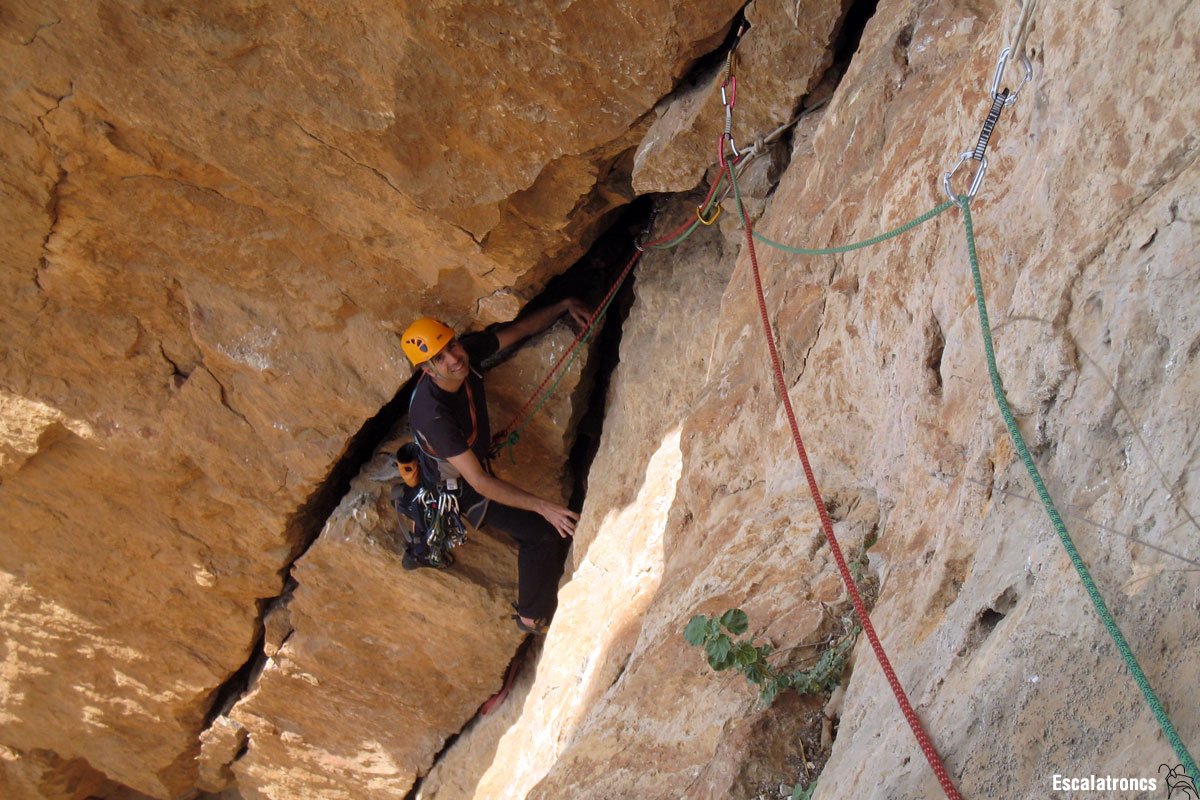 Tot i que la via s’inicia una mica més a la dreta, per una placa vermella (fletxa a l’inici), nosaltres l’encarem pel fil de l’esperó just sota el gran sostre somital, des d’on veiem una vaga d’un pont de roca. Seguim escalant per l’esperó i anem a atènyer una fissura ampla cap a l’esquerra. Finalment creuem la placa cap a la dreta per entrar a la reunió. 30 metres i un pont de roca.
