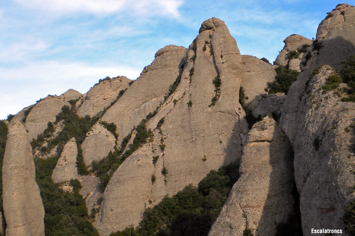 Fem un curt ràpel per la cara nord-est fins el coll o bé desgrimpem i d’allí anem a buscar el camí de Sant Jeroni.