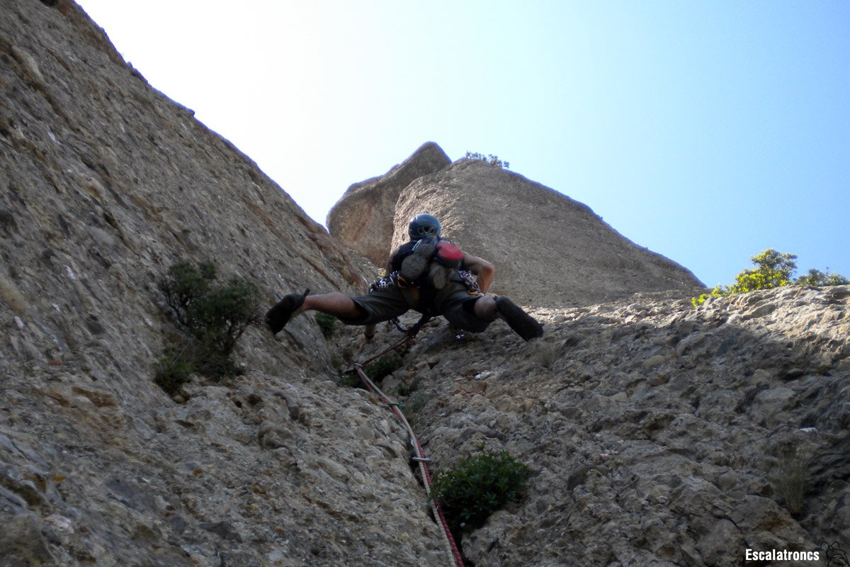 Aquesta tirada es fa pràcticament tota en escalada artificial, tot i que ha estat re-equipada per poder forçar-la en lliure al gust (roca molt bona). Anem trobant parabolts intercalats amb velles pitonises. Abans d’arribar a la reunió, que és sota el sostre, tenim un tram en lliure senzill. 35 metres.
