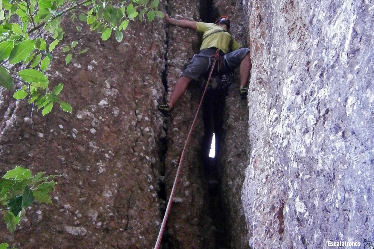 Ara ens enfilem per la curta Cimbalet del Bruc, que permet guanyar el mur que tenim davant i ens deixarà al peu de la Normal de l’Agulla del Capdemunt. Es tracta d’una placa de presa petita i gest, amb un únic espit i no protegible més amunt, amb caiguda directa a terra. Així doncs toca cop de gas i sortir ràpid de la vertical. La reunió la muntem aprofitant una alzina. 20 metres i un espit.