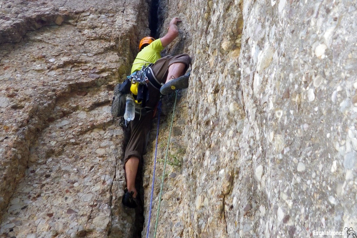 Enfilem la fissura amb un parell de passos d’artificial equipat, que continuen amb un parell més a equipar (fàcil amb tascons mitjans o friends equivalents). Després la fissura obliqua a la dreta i quan aquesta acaba sortim fàcil en lliure i arribem sense més entrebancs a la reunió, que s’ha de muntar. 30 metres.