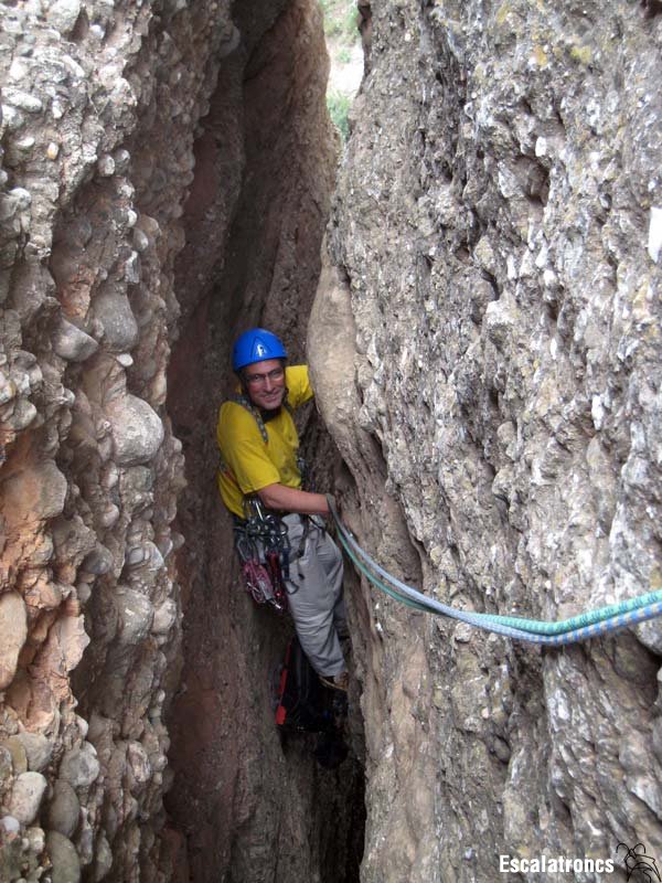 Hem de sortir cap a la dreta i introduir-nos entre la gran llastra i la paret. L’escalada és en ramonage i es fa al gust. Personalment vaig anar molt bé guanyant alçada a l’entrar i després anant en diagonal ascendent fins a la reunió, que és a l’altra banda de la llastra. Aquest llarg és net. Molt recomanable portar la motxilla i les sabates penjades entre les cames.