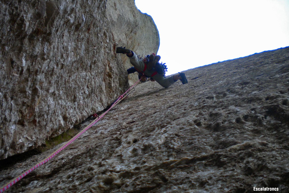 Els primers metres són una fàcil grimpada per uns ressalts que ens menen a la reunió 0. Seguim endavant resseguint una filera de burins (6a) tot i que nosaltres vam tirar d’A0 donat que aquest tram era pràcticament una cascada. Un cop superat el primer tram d’artificial seguim uns metres fàcils fins que tornem a enfilar la burinada que acaba fent un flanqueig a la dreta per entrar de ple al diedre, que ja no abandonarem pràcticament fins al cim. Aquests darrers metres de diedre són un tastet del que ve a partir d’ara: encastaments combinats amb molta col·locació i verticalitat constant. 50 metres, molts burins, algun clau i algun parabolt.