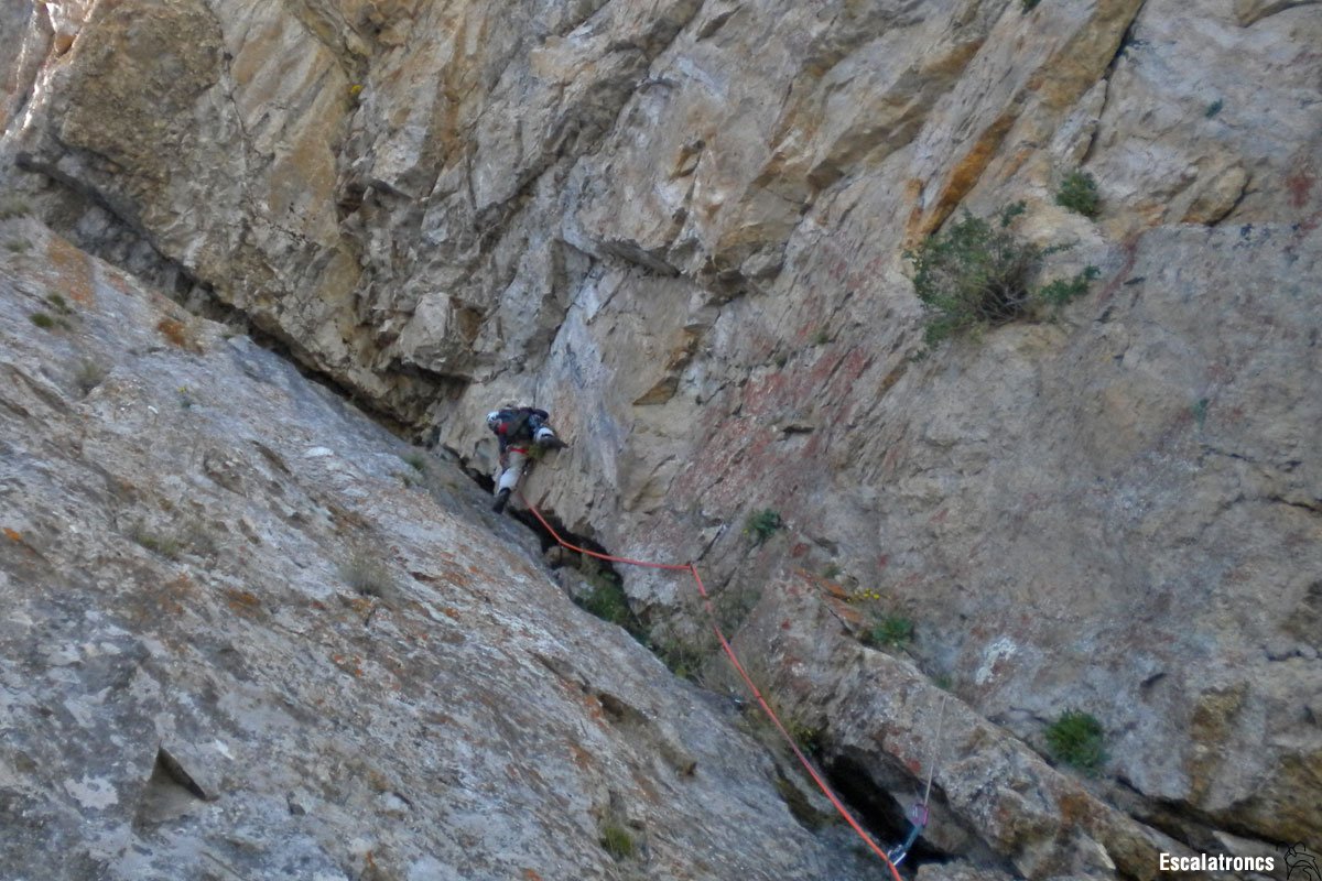 Iniciem el llarg anant a buscar la fissura vertical que ens queda a la dreta. Un primer pas potent (protegit per un clau) ens permet atènyer la fissura i seguir avançant, combinant tècnica de diedre amb algun encastament. Pel camí trobarem un parell de claus més i podrem emplaçar alguna peça si és menester. A l’alçada d’una petita lleixa sortim cap a l’esquerra i trobem la segona reunió de 3 espits. 20 metres, 3 claus.
