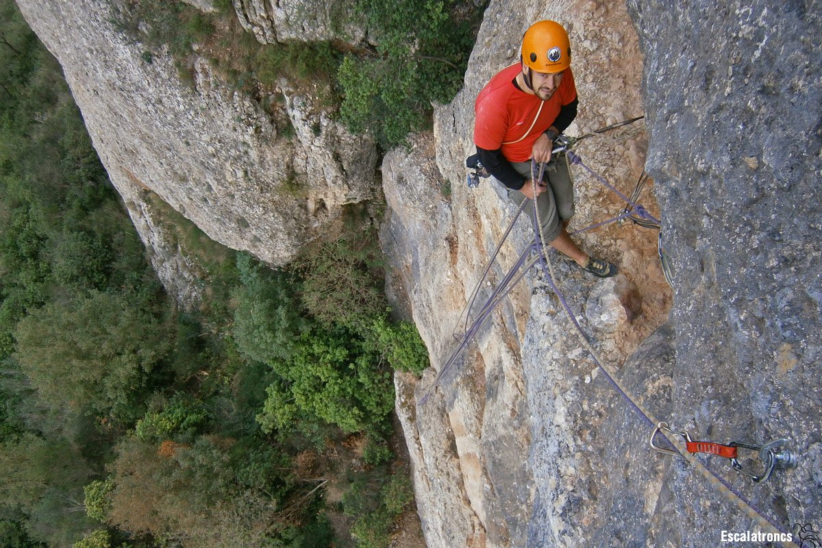 El primers metres transcorren per una fissura ampla que forma la paret amb una llastra. La roca en aquest tram està escrostonada i haurem de parar compte. La segona part del llarg transcorre en lliure per una placa taronja que dóna pas a uns darrers metres amb 3 passos d’Ae per atènyer la reunió. 10 parabolts i 2 ponts de roca, 30 metres.
