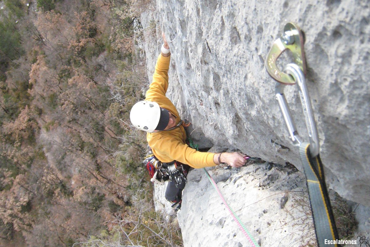 Iniciem la tirada en diagonal a l’esquerra, anirem trobant algun clau i pont de roca. Seguim ara a la dreta fins trobar una fissura ampla que haurem de superar amb passos al inici no gaire evidents. Més amunt tenim un altre petit tram de placa per tornar a atènyer la fissura, ara més franca, que ens porta fins la reunió, penjada i poc còmoda (dos parabolts amb anella). 25 metres.