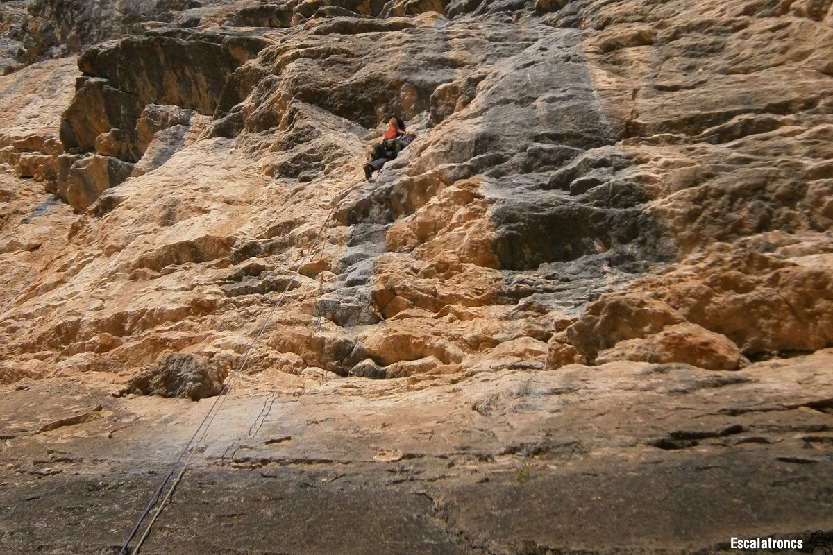 La primera part del llarg és una agradable placa de franges i roca excel·lent que hem de creuar diagonalment a la dreta fins situar-nos al peu d’una fissura. A partir d’aquest punt la roca és trencada i haurem de parar compte. La reunió queda rera uns arbustos i costa de veure. 40 metres. 3 parabolts.