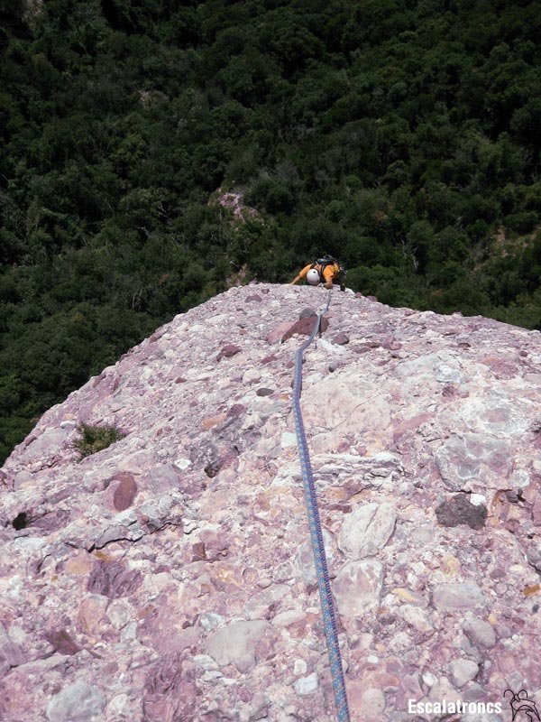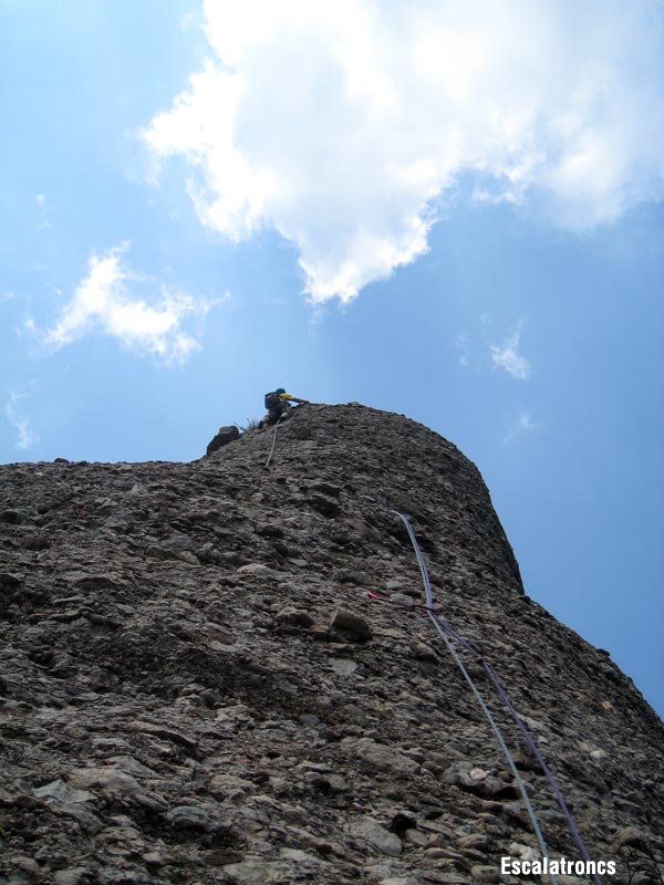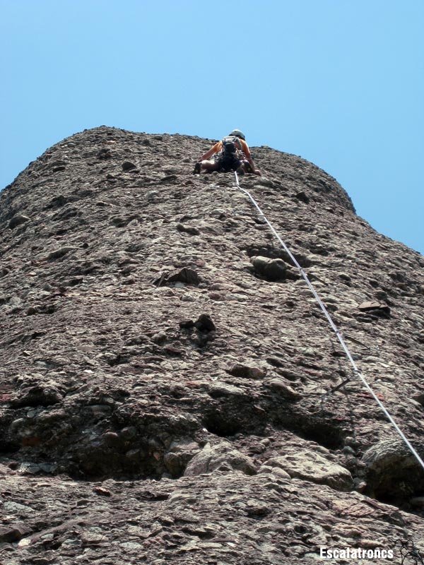 Ens enfilem a l’agulla escalant en tendència a la dreta per anar a caçar el primer químic, que es troba força amunt. Seguim recte fins a la segona assegurança que també allunya, però la qualitat de la roca dóna molta confiança. Ara la paret s’adreça del tot i ens trobem amb el pas més complicat del llarg, però que es troba ben protegit. Seguim escalant recte amunt fins situar-nos a un forat on podrem prendre una mica d’aire i col·locar una plaqueta recuperable a un cap de burí. Una altre volta vertical i excursió fins al següent pnt d’assegurança. Una mica cap a la dreta per xapar el darrer químic del llarg i una altre passejada ara menys vertical fins la reunió. Surt un llarg de 45 metres, amb les assegurances justes però sense ser realment exposat.
