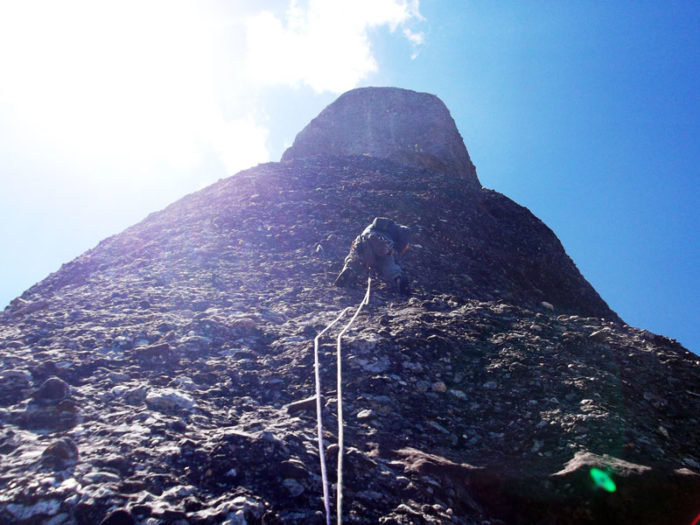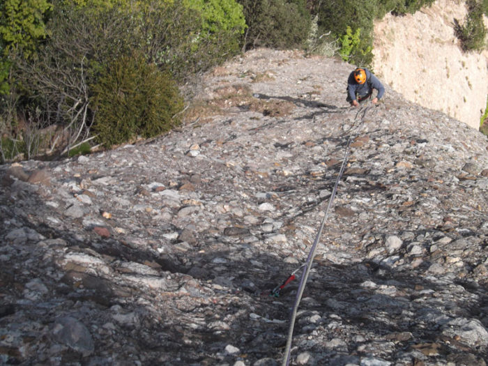 El primer llarg serveix per situar-nos al llom de l’aresta. El segon és una petita joia, roca exel·lent en un mar de còdols cantelluts que ens ajuden a progressar amb tota tranquil·litat. Trobem un espit a mitja tirada i podrem llaçar algun merlet.