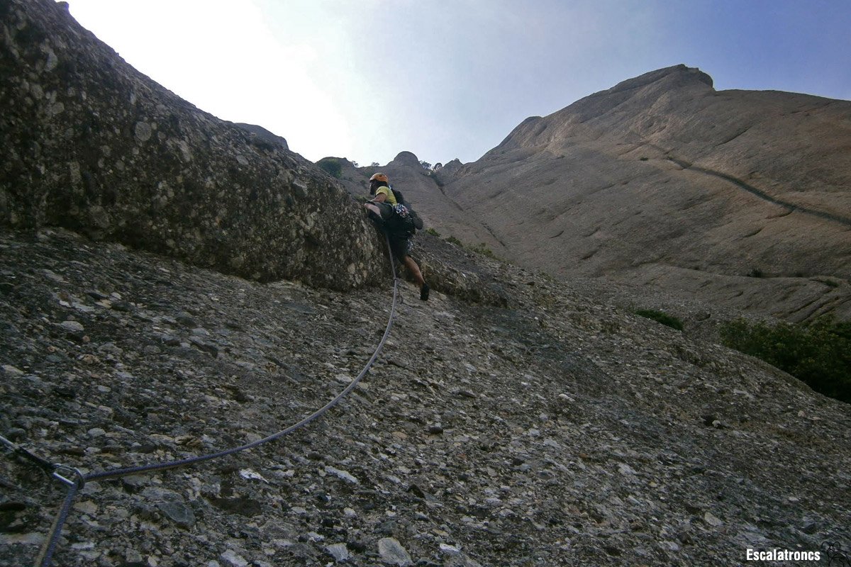 Des del cim fem un curt ràpel pel vessant oest fins el coll. Remuntem unes plaques amb l’ajut d’una corda fixa i acabem d’arribar al cim. Des d’allí anem a buscar la Canal de Sant Jeroni.