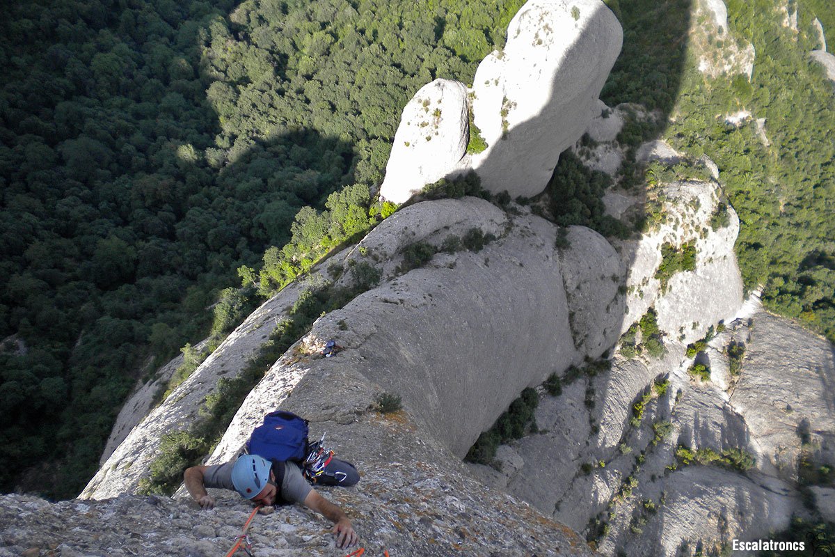 Arribat a aquest punt la posició ja és prou elevada i l’ambient de gran paret. En aquest llarg, també molt assegurat, despleguem l’escalada més montserratina, jugant amb l’equilibri i la bona presa que anem trobant. A mitja tirada la cosa es posa un pèl desplomada i haurem d’esprintar si volem passar en lliure. A mida que ens apropem a la reunió les preses cantelludes tornen a aparèixer i la dificultat es suavitza. La reunió és penjada. 35 metres.