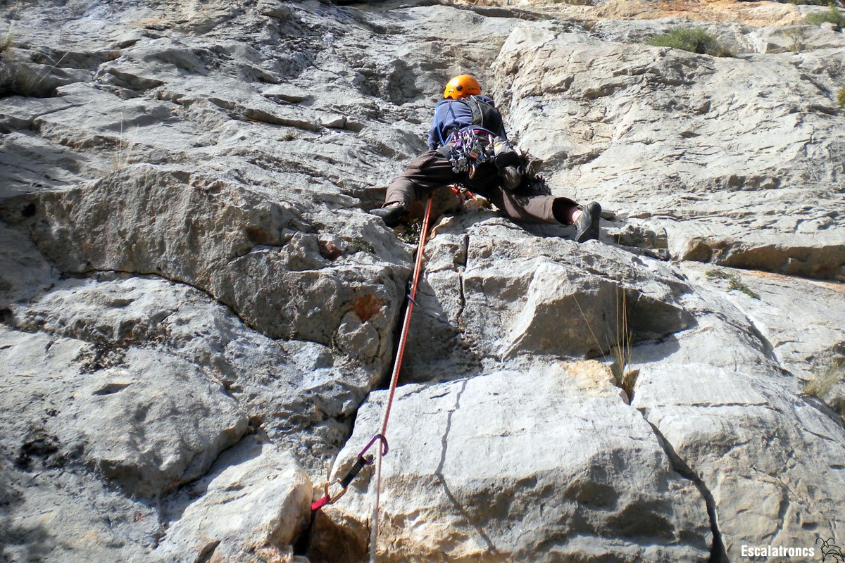 La tercera tirada s’ha redreçat, cercant les parts que més tiren. No obstant, després de fer la variant d’entrada seguim per l’itinerari original, que segueix la lògica d’una fissura diagonal i busca el terreny més fàcil per sortir a la feixa. Un cop en aquesta anirem cap a l’est fins trobar un bloc on hi trobarem la reunió. 2 parabolts (si fem la variant de sortida trobarem un parell d’expansions més), 45 metres.