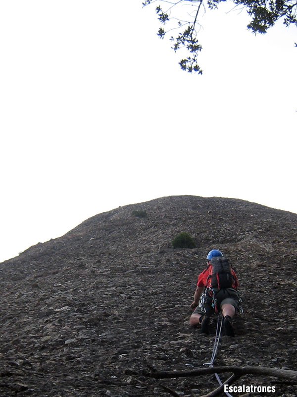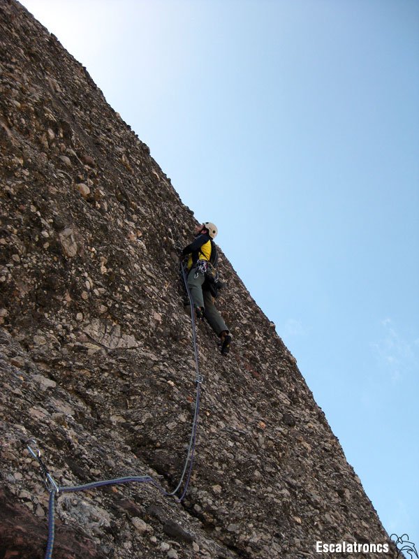 Sortim de la reunió en tendència a la dreta fins situar-nos al peu d’una placa vertical. Un cop xapat el primer espit hem de seguir recte, amb uns passos força estètics sobre bons còdols. Un cop passada la tercera assegurança la placa es va ajaient fins arribar a la reunió. 30 metres.