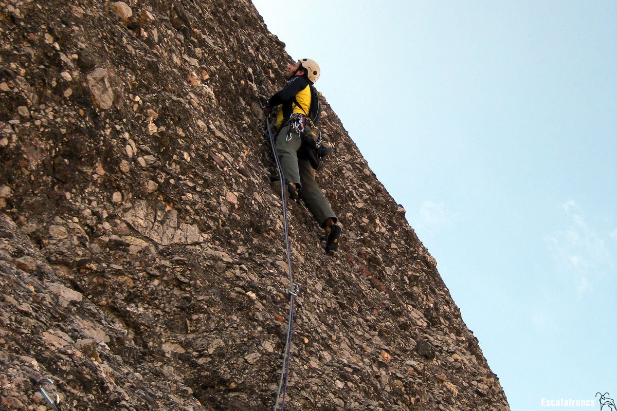Hem de sortir de la balma cap a la dreta. La sortida cal dir que dona un cert respecte, donat que no es veu el primer espit i la placa és dreta. Tot i això la sortida és molt fàcil, amb presses genials i de seguida trobarem la primera assegurança. Per evitar el factor 2 podem col·locar un Camalot del 2 a la part dreta de la balma. Un cop xapat el primer espit hem d’escalar en diagonal cap a l’esquerra fins situar-nos sobre la reunió i després seguir més o menys recte amunt. De nou anirem trobant algun punt d’assegurança. 30 metres.