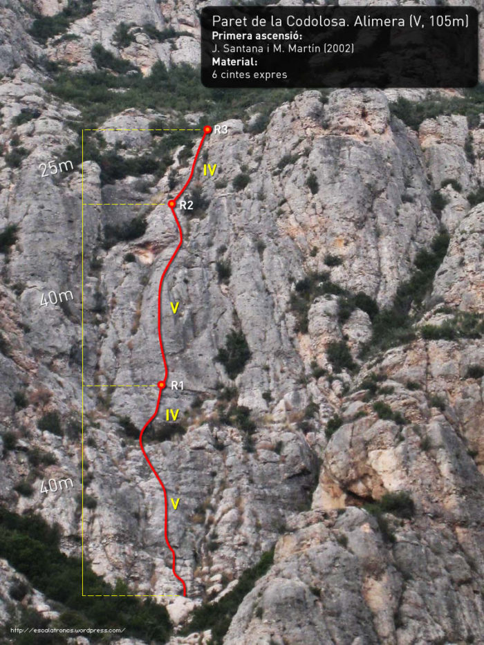 La Paret de la Codolosa forma un amfiteatre davant Collbató. En ella trobem força itineraris de dos o tres tirades de dificultat mitjana i amb bona roca en general. A l’extrem dret de la paret hi ha l’Alimera, una senzilla via de tres llargs, perfectament assegurada, ideal per tots aquells que comencin a fer de primer de corda o per qui cerqui una escalada ràpida i sense compromís.