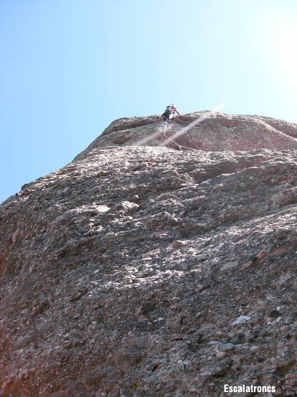 El llarg s’inicia marxant de la reunió per la dreta i enfilant-nos per una placa amb bona roca. De seguida la placa es tomba i seguim caminant cap a la reunió, superant algun petit ressalt. 30 metres.
