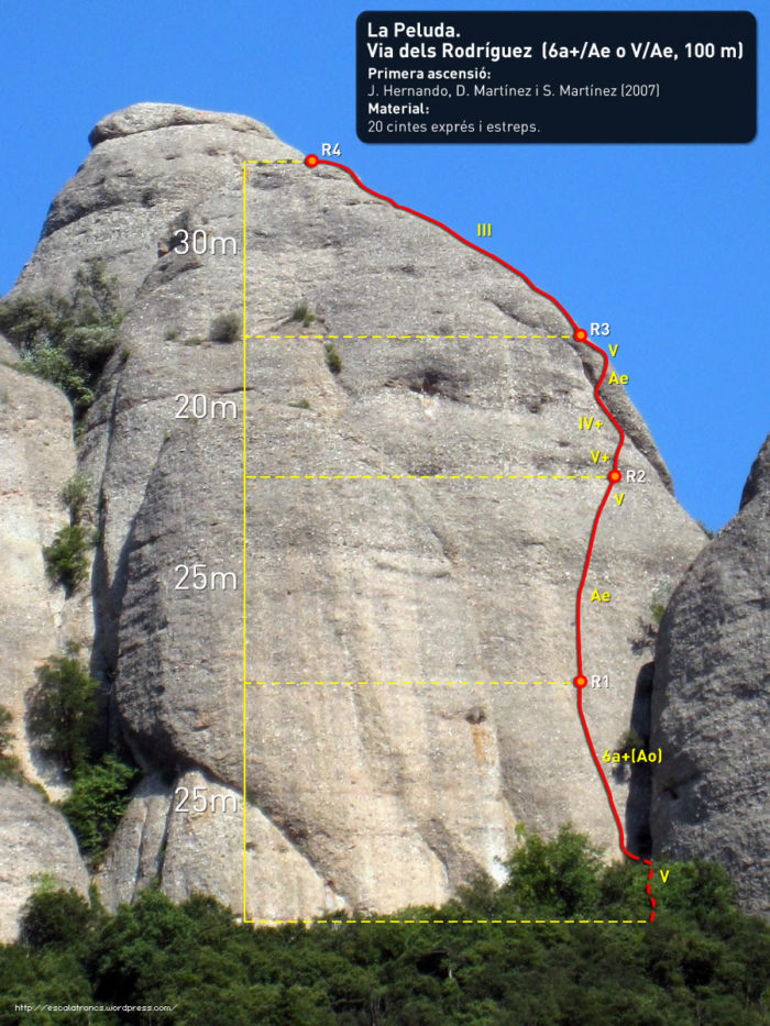 La Muralla Oest d’Agulles és una bona opció pels matins calorosos d’estiu donat que la seva orientació ens garanteix una bona ombra fins a les tres de la tarda. La Via dels Rodríguez guanya el cim de la Peluda per aquest vessant; equipada generosament amb parabolts ofereix una escalada vertical i amb cert ambient però amb un compromís pràcticament nul. En definitiva, una bona opció per iniciar-se en l’us dels estreps o per passar un matí sense gaires preocupacions.