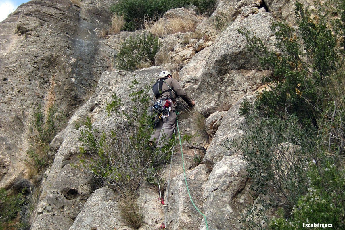 Sortim de la reunió superant un petit tram de roca una mica lletja per col·locar-nos sobre una placa amb millor aspecte on trobarem un primer espit; d’allí hem d’anar amunt i cap a l’esquerra fins trobar un clau. Un cop xapat pugem els peus fins l’alçada del clau i busquem una molt bona pressa a la dreta, que amb un pas força atlètic ens permet passar a la dreta. Des d’aquest punt comencem a escalar un petit diedre fins xapar un espit que queda a la dreta. Un metre més a la dreta veurem un altre espit; en contes d’intentar passar a la dreta per xapar-lo, seguim mig metre més amunt i trobarem bon cantell per anar flaquejant en bavaresa cap a la dreta i poder xapar l’espit. Un cop xapat pugem una mini lleixa i seguim una mica cap a la dreta, on trobarem una nova assegurança a l’alçada del cap. Ara escalarem per una fissura fàcil fins atènyer un nou espit. Un cop xapat seguim una mica en diagonal a l’esquerra per col·locar-nos sobre un slap. Al mig de la placa veurem un espit (no és molt recomanable xapar-lo perquè farà que les cordes freguin molt). Anem en diagonal a la dreta a buscar un diedret una mica descompost. A la part esquerra podem xapar un nou espit. En aquest punt a la ressenya original marca un pas d’Ae, però surt molt bé en lliure: es tracta de tibar una mica per superar el diedre que desploma lleugerament i col·locar-nos a sobre. Un cop superat aquest pas seguim escalant pel costat esquerra de la fissura (podrem llaçar una savina) fins superar un nou ressalt. Ara l’escalada es torna molt senzilla i haurem d’anar en lleugera tendència a l’esquerra fins trobar la reunió. 7 espits i 1 clau; 50 metres.