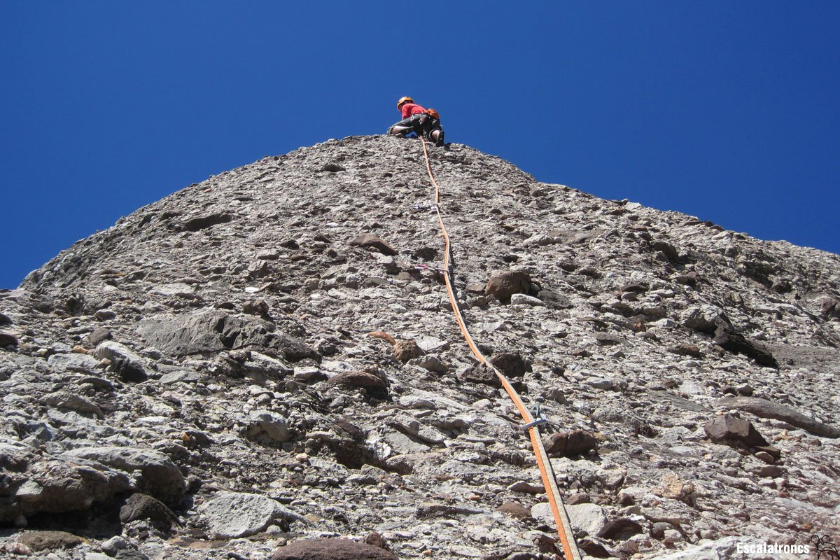 Aquesta darrera tirada es desenvolupa sobre una placa inclinada amb un parell de trams més verticals, però la principal característica és l’excel·lència del rocam, aspre i cantellut, tot un luxe que val la pena degustar amb calma. 35 metres.