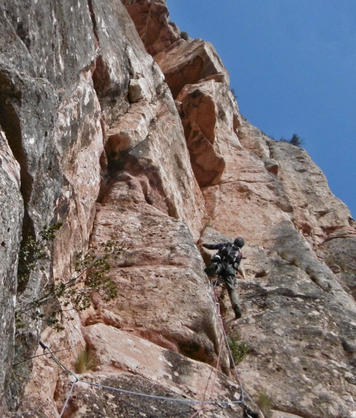 Marxem cap a la dreta per anar a cercar un corriol poc definit que va a petar a una instal·lació de ràpel. Fem un ràpel de 45 metres que ens deixa al costat del camí.