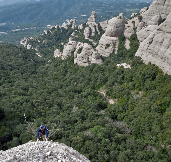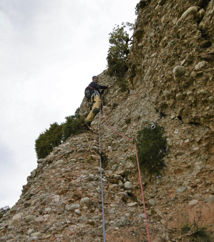 Desgrimpem uns metres pel vessant nord i anem a buscar una savina des d’on podrem fer un curt ràpel cap a l’est que ens deixa a la canal.