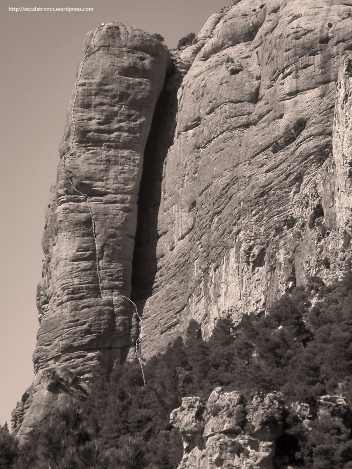 La podem dividir en dues parts, la primera, fins a la R4 de fissures i la segona més plaquera. El primer llarg segueix una mena de canal/xemeneia amb un pas d’allò més curiós (on trobarem l’única expansió de la tirada. La segona tirada és un flanqueig amb roca a controlar. El tercer és potser el millor llarg, tirada de 50 metres resseguint una fissura atlètica amb algun pas concentrat més difícil; a mig llarg hi ha una reunió.