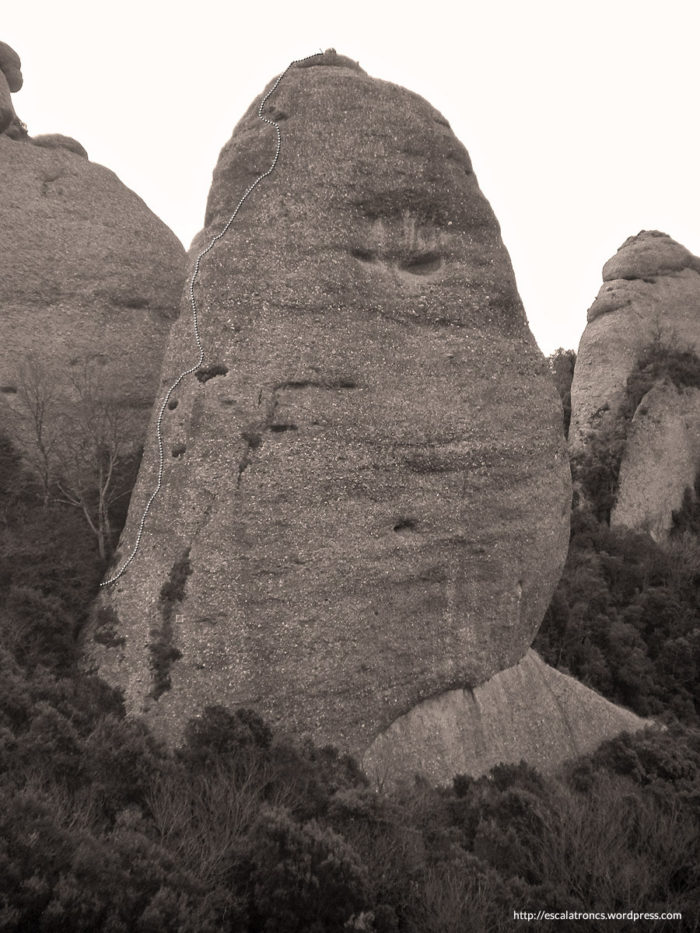 La via comença al costat del camí pel lloc més evident; els primers metres són  recoberts de molsa. La tirada es va redreçant fins al clau (finet), uns metres abans es pot pitonar amb traça. Des del clau marxem a la dreta, on trobarem la reunió que no hem fet. Es continua directe cap un merlet molt característic que podrem encintar i d’allí en lleugera tendència a la dreta fins un llavi on hi trobarem una expansió. Si seguim amunt en tendència a la dreta trobarem un bon forat per un Camalot #1. D’aquí al cim resta només una empenteta.