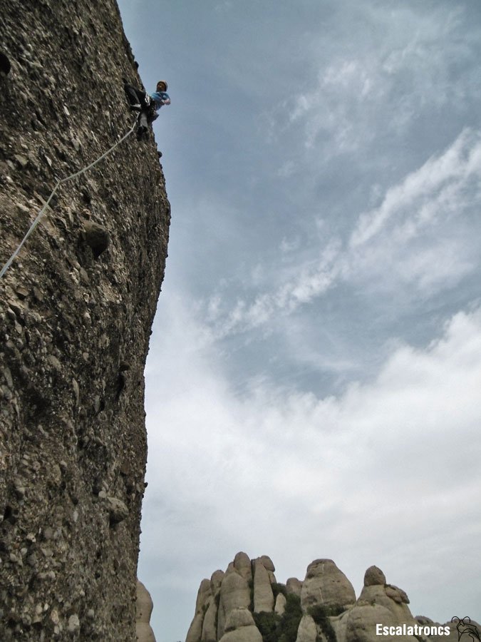 Escalada de dos tirades completament equipada, encara que obligada, es nota que es va obrir per sota. El primer llarg és realment llarg i mantingut, amb el pas clau una mica abans d’arribar a la meitat. La segona tirada marxa cap a la dreta a buscar un còdol característic per encarar un bon mur; un cop superat aquest la paret perd empenta fins al cim.