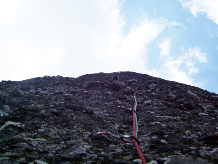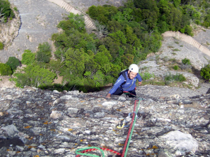 Sortim recte amunt i comencem el festival de grans còdols. La tirada és més tombada que l’anterior i si li afegim l’abundància de presses ens surt un llarg tot diversió. 25 metres.