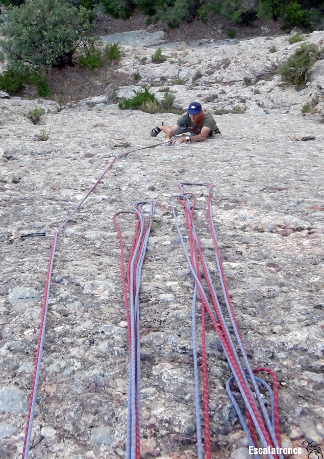 Un ràpel de 60 metres fins a la R-2 i d’allà un altre al terra. També es pot rapelar de reunió a reunió.