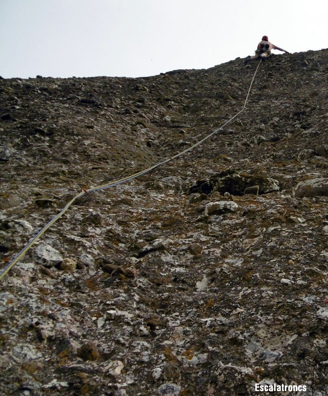 Amb un inici rabiós, la primera tirada és la més exigent, pura continuïtat. L’entrada a la reunió també és curiosa. La segona tirada concentra la dificultat en una panxa atlètica, que demana un cop de gas. El segon i el tercer llarg es poden empalmar sense problemes. La darrera tirada comença amb un altra panxa per després marxar cap a la dreta. Malgrat l’aspecte una mica rovellat de les expansions aquestes es troben en un estat prou correcte.