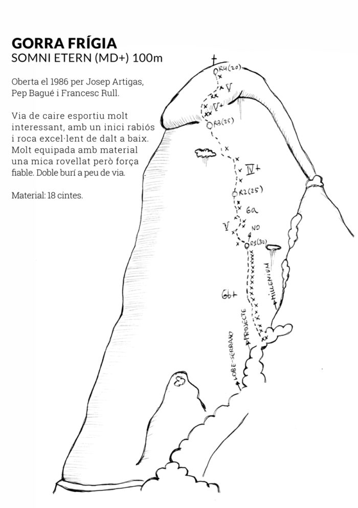S ens dubte una de les grans oblidades de la transitada Gorra Frígia és aquesta preciosa Somni Etern. Via d’esperit esportiu, ofereix 4 boniques tirades de conglomerat excel·lent.