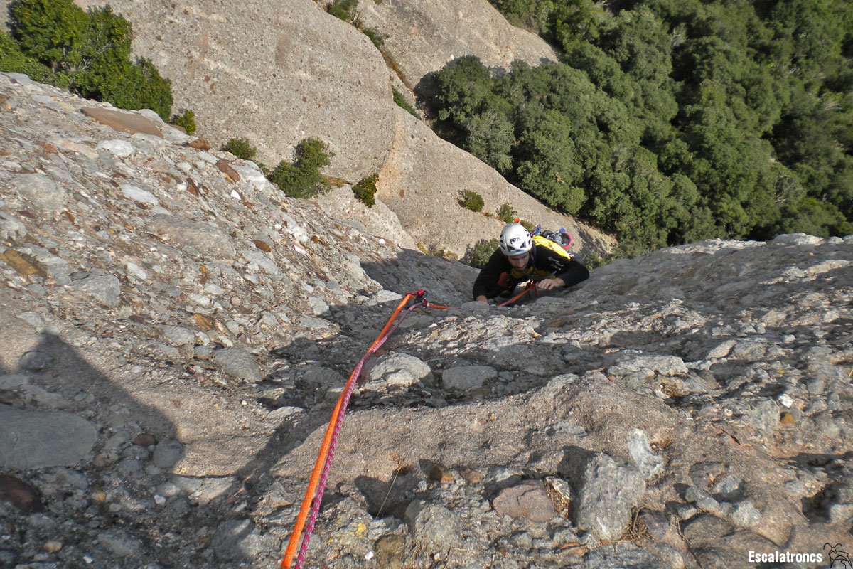 Sortim de la reunió flanquejant cap a la dreta fins trobar una nova canalera, la qual enfilem sense miraments. L’escalada és agradable, sobre roca franca i de nou lleugerament exposada, ja que, com en la tirada anterior, podrem emplaçar algun friend o tricam, que ens asseguraran el llarg. 40 metres, tirada neta.