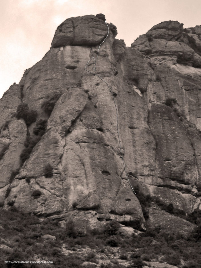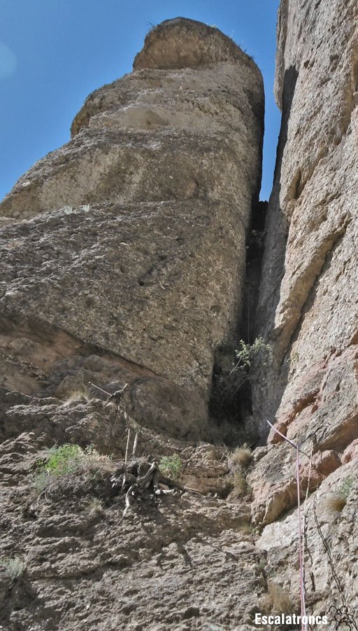La primera tirada és una xemeneia ben franca, el pas més complicat és per entrar-hi; un cop situats dins es progressa força bé fins al coll on fem la reunió. El segon llarg és curt i el fem en ramonage fins que podem passar al Timbal i guanyar el cim ràpidament. El tercer és el més laboriós, delicat fins caçar la fissura que es pot pitonar al gust (els flotants no queden sempre bé). Un cop afluixa anem a buscar un arbust i un cop llaçat sortim cap a fora, on trobarem el cap de burí i d’allà fàcil fins al cim.