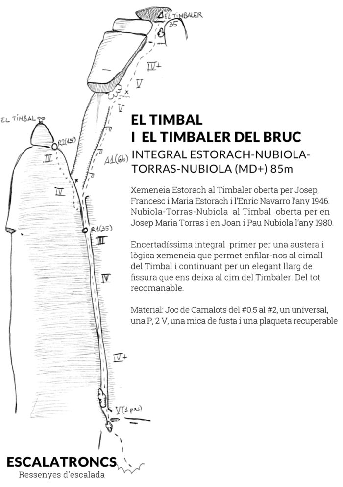 I ho fa combinant dos vies precioses: la Xemeneia Estorach al Timbal i la darrera tirada de la N-T-N al Timbaler. Malgrat la brevetat del recorregut podrem gaudir d’una escalada del tot variada, amb una xemeneia amb la mida ideal, una fissura que podrem superar en artificial o en lliure potent i una agradable placa de sortida.