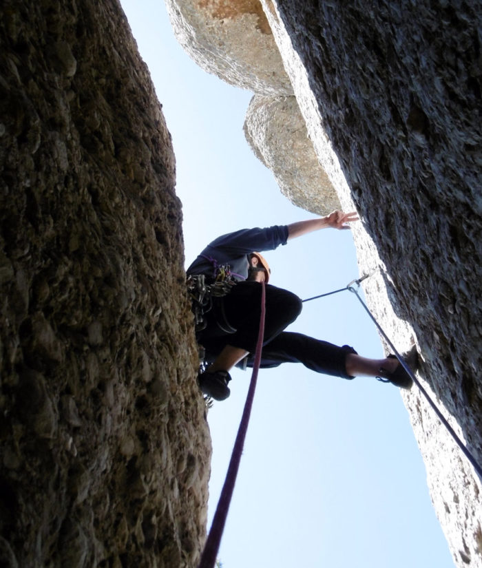 • Material: 12 cintes, joc de Camalots del #0.5 al #2, un universal, una P, dos Vs, una mica de fusta i una plaqueta recuperable. Un estrep si no anem en lliure