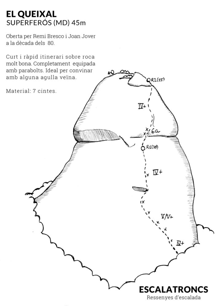 El Queixal és una discreta roca encarada a l’oest que tanca la Canal Ampla pel capdamunt. A la dècada dels quaranta s’hi enfilaren per primer cop els germans Estorachs pel vessant nord, un muret d’una quinzena de metres, obrint la via Normal.