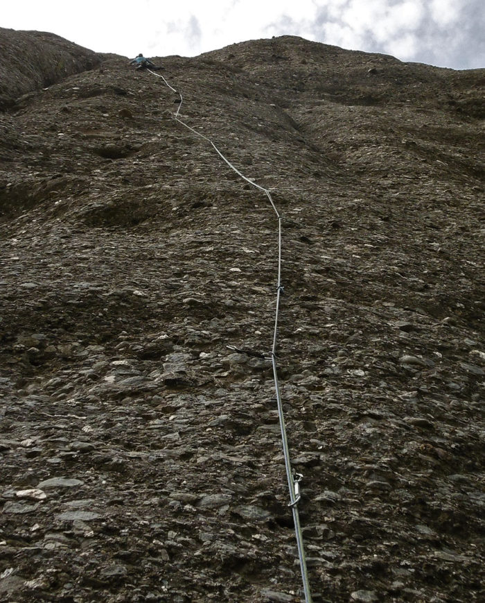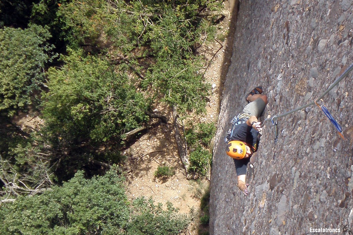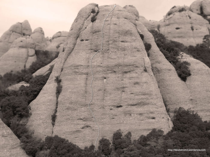 Escalada de dos tirades completament equipada, encara que obligada, es nota que es va obrir per sota. El primer llarg és realment llarg i mantingut, amb el pas clau una mica abans d’arribar a la meitat. La segona tirada marxa cap a la dreta a buscar un còdol característic per encarar un bon mur; un cop superat aquest la paret perd empenta fins al cim.