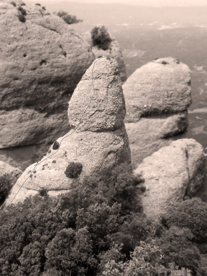 Al cim hi trobarem un ferro i un espit molt rovellat. Potser la millor opció és pujar primer un, desgrimpar assegurats des del cim i després pujar l’altre.