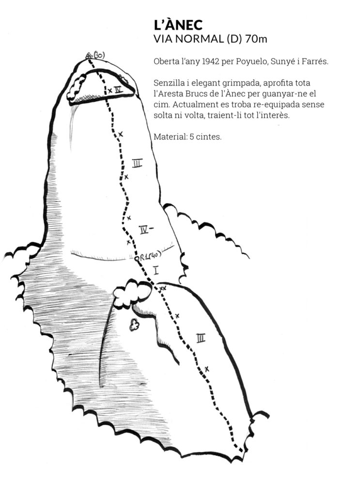 Completament equipada, la via no té pèrdua. Hem de grimpar des de la base del vessant sud fins arribar a un replà on es munta la primera reunió (en trobarem una abans que no cal fer). La segona tirada és més interessant amb el pas més complicat abans d’arribar al cim, un moviment de IV grau molt elegant que antigament es protegia clavant al llavi.