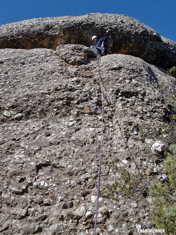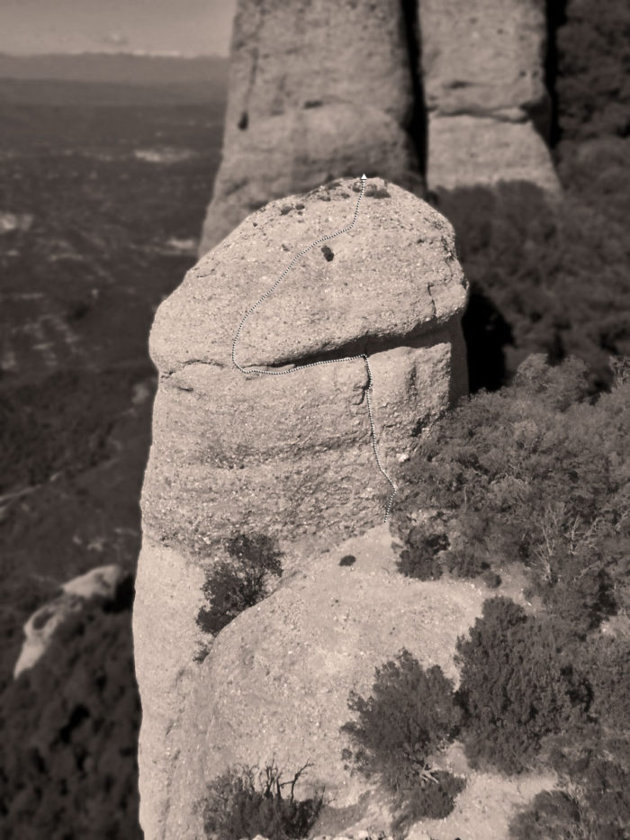 La via s’inicia a la vertical de una llastra característica. L’escalada es va afinant a mida que anem enfilant-nos. Arribem a una petita fissura que permet emplaçar-hi un bon friend o tascó, val la pena entretenir-s’hi ja que tot seguit ve el pas clau.
