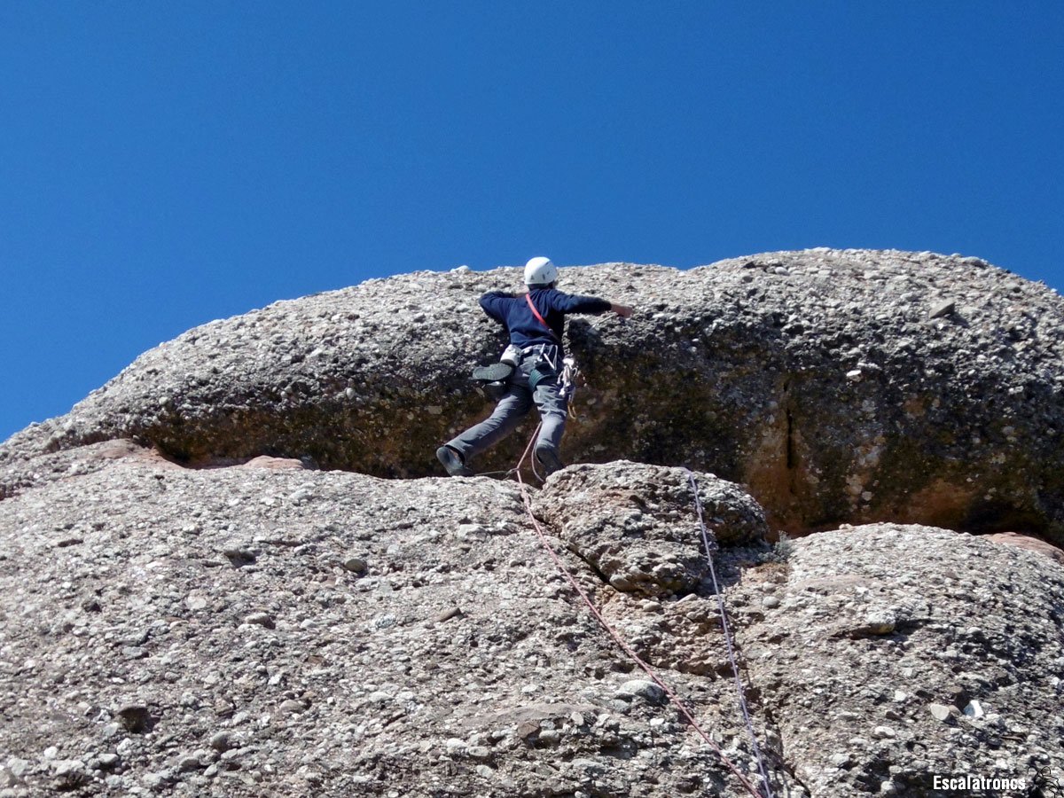 Un cop haguem guanyat el llavi horitzontal trobarem bons emplaçaments pels flotants. Flanquegem el llavi cap a l’esquerra per trobar el pas més dèbil, just a la part final de la vira i d’allí fàcil fins al cim.