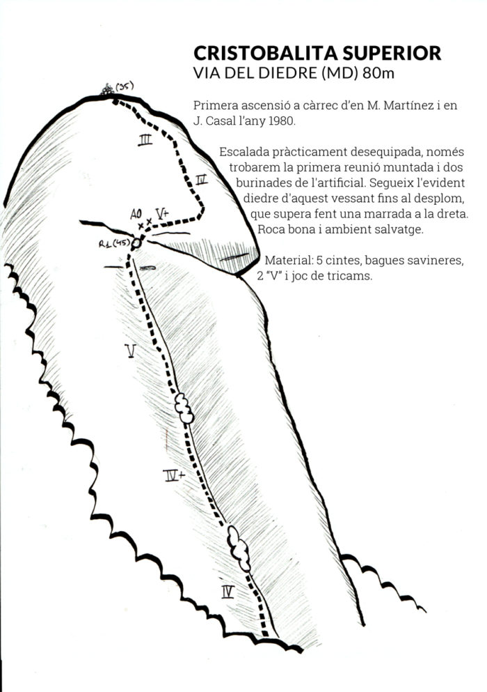 La via va a buscar l’evidentíssim diedre que ressegueix el vessant sud-oest de l’agulla. Malgrat que des del peu de via sembli un rostoll a mida que ens elevem al diedre cada cop es va fent més perfecte. Un cop passats els arbres l’assegurament es fa més complicat donat que no hi ha una fissura franca, tot i això hi ha un parell de bons ‘clavaderos’. La segona tirada comença amb dos passos d’A0 i una sortida en lliure prou curiosa, en flanqueig a dretes per anar a buscar el centre de l’aresta. La roca en conjunt és bona, tot i alguna crosta que pot saltar.