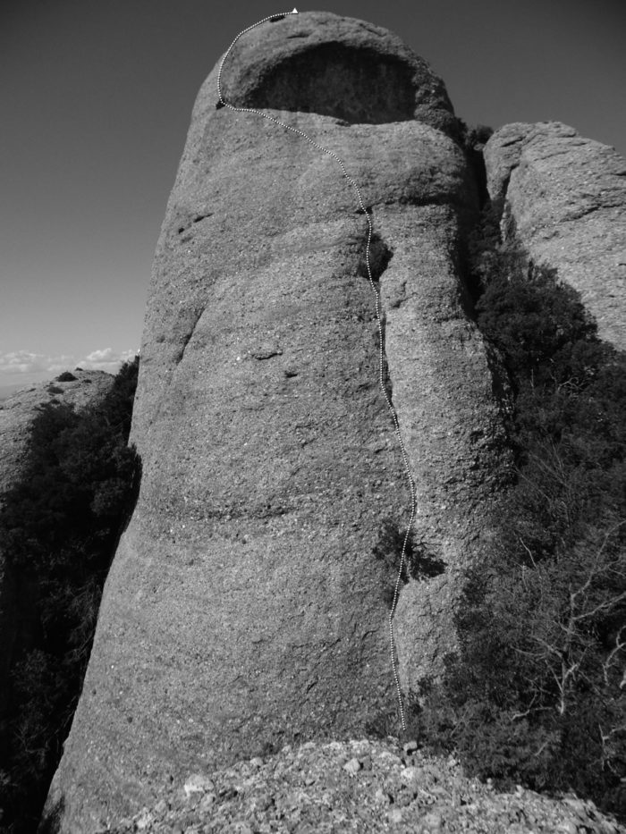 No te pèrdua, seguim fil per randa la llastra que domina el vessant sud i fem reunió al final d’aquesta (2 claus); una mica més amunt hi ha una reunió d’espits (??). La segona tirada evita el sostre per l’esquerra, trobant el pas i duent-nos per un curt diedre fins al cim de l’Agulla.