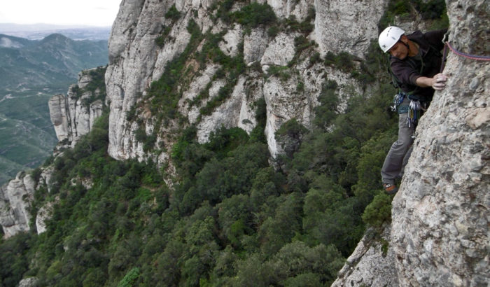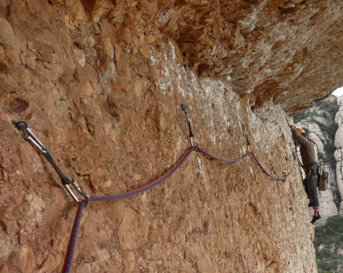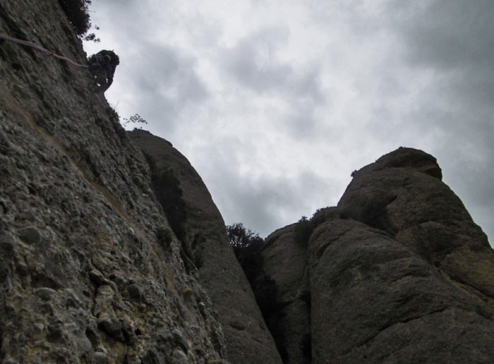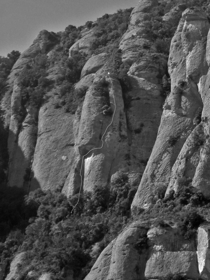 La via consta de tres tirades, la primera ressegueix un diedre de llibre, tot i que escalarem un tram per la placa de l’esquerra. El segon llarg és un fotogènic flanc amb el Monestir de fons, totalment equipat i poc obligat. La darrera tirada és en placa mantiguda en V, amb la roca delicada en algun punt. Ombra a partir de les 15 hores.