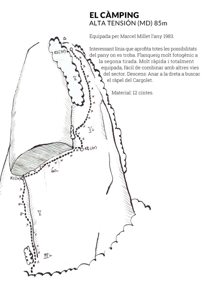 L‘Alta Tensión és una interessant proposta per acabar d’arrodonir una jornada d’escalada a la zona del Càmping. Totalment equipada, aprofita amb avarícia les possibilitats del pany de paret per on s’enfila.