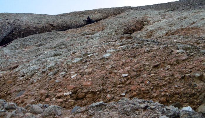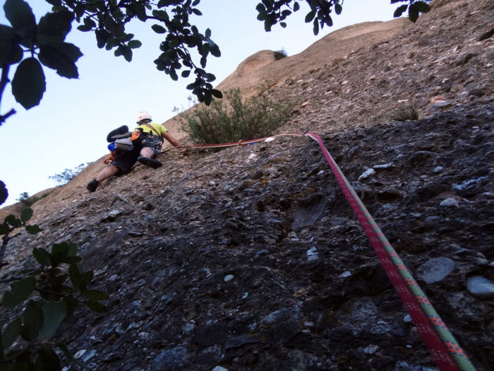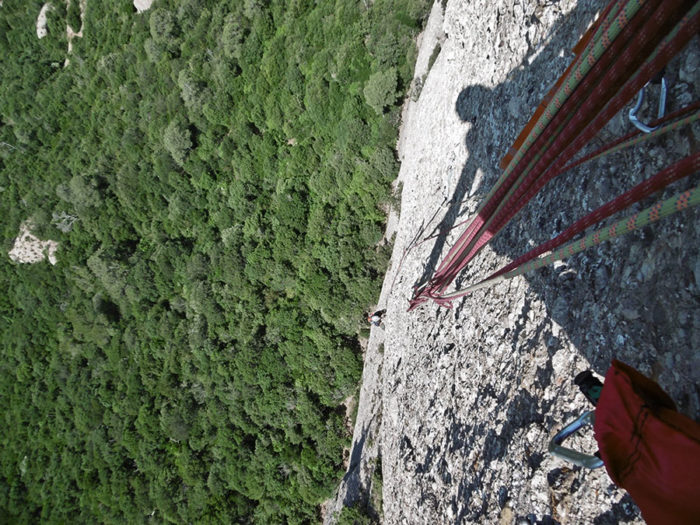 Fem un ràpel curt cap al sud que ens deixa a la canal entre la Bandereta i l’Agulla dels Espeleòlegs. Seguim la canal cap al sud.