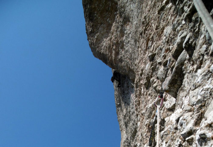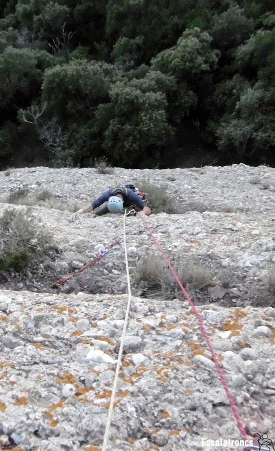 La tercera tirada és una corrua de reblons, amb algun parabolt intercalat. S’ha de fer un pas de ganxo a mitja tirada (amb una mica de fusta i un universal ens estalviem el ganxo).