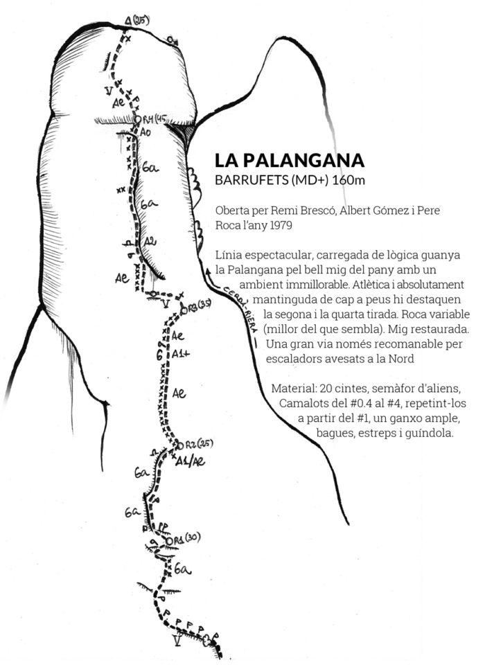 Per la façana oest de la Palangana, un petit Big Wall de vertiginosa verticalitat, s’enfila l’atrevida Barrufets. Un cop escalada hom es fa creus com aquesta línia no ha esdevingut una clàssica del vessant Nord; segurament qualitat del rocam i equipament (tot i que actualment es troba pràcticament restaurada) han fet de filtre. No obstant, si no s’és molt llepafils i s’està bregat a la Nord, sens dubte és una ruta d’obligat compliment.